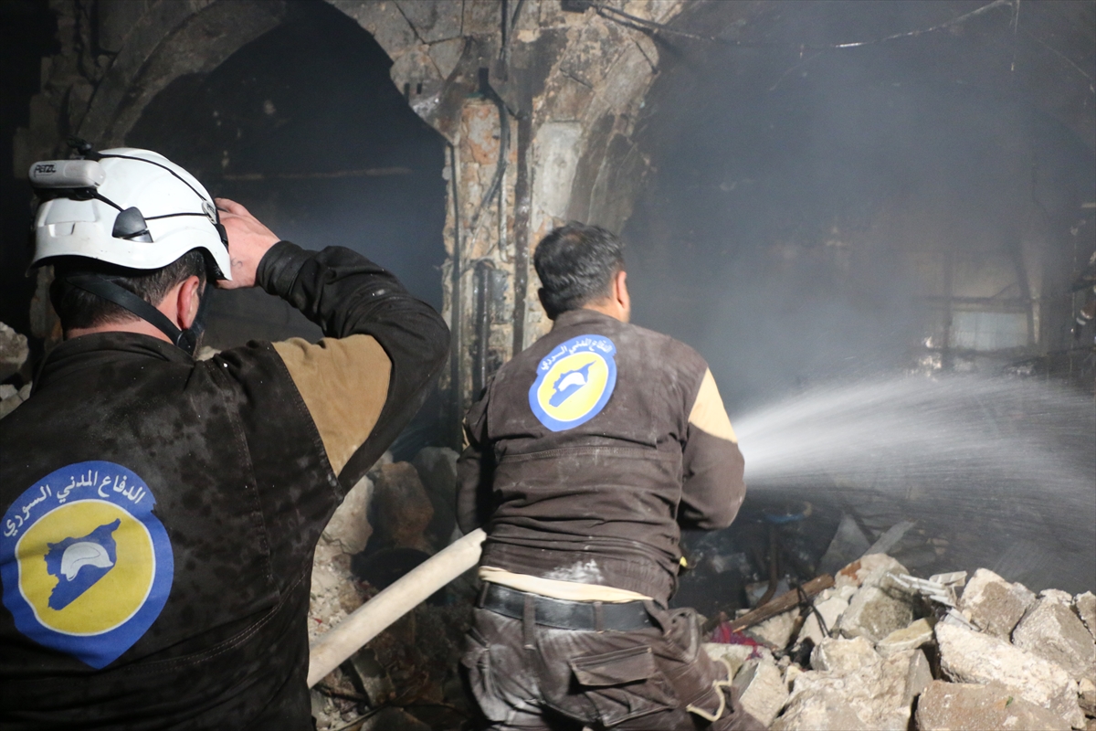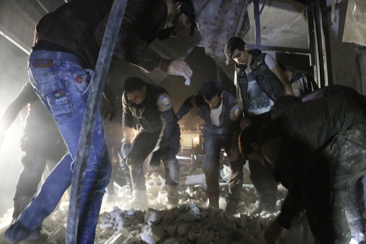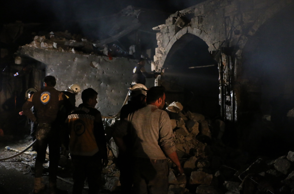 IDLIB, SYRIA: Civil defense team members and civilians conduct a search and rescue operation at scene after an airstrike over a market place in Harem district of Idlib, Syria on March 22, 2018. At least 28 civilians were killed on the attack.
