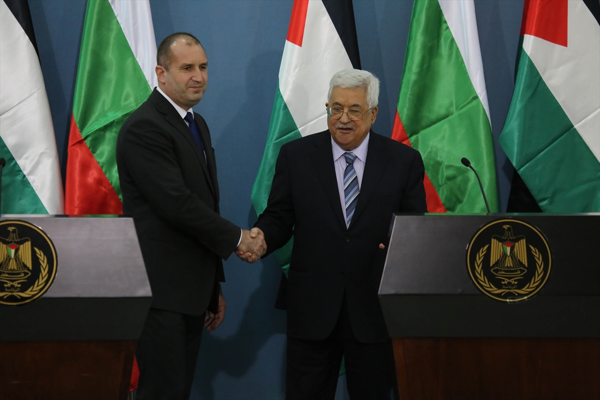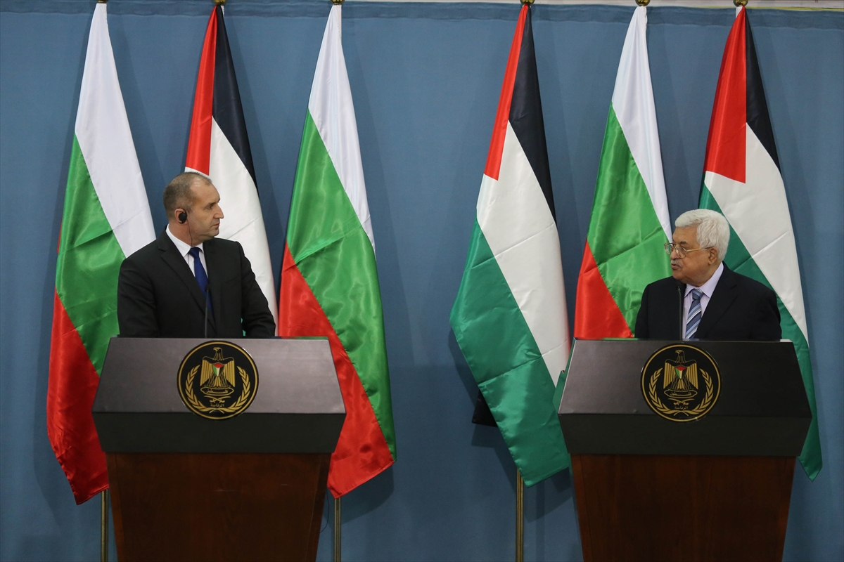 Bulgarian President Rumen Radev in Ramallah March 23, 2018 RAMALLAH, WEST BANK: Bulgarian President Rumen Radev (L) and President of Palestine Mahmoud Abbas (R) hold a joint press conference following their meeting at Presidential Palace in Ramallah.