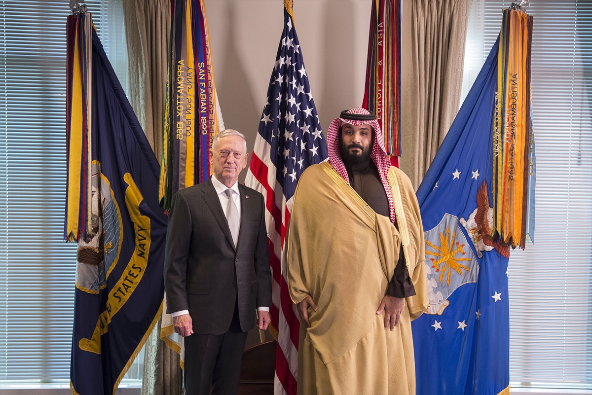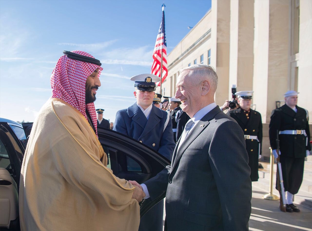 Crown Prince of Saudi Arabia Mohammad Bin Salman in Washington March 23, 2018 WASHINGTON, USA – MARCH 21: Crown Prince of Saudi Arabia Mohammed bin Salman Al Saud is welcomed by the U.S. Secretary of Defense, James Mattis during his official visit in Washington.