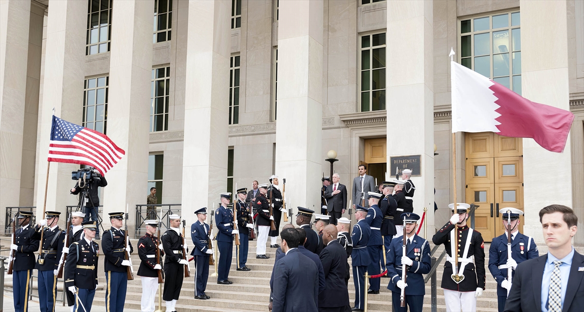 Emir of Qatar Tamim bin Hamad Al Thani in USA April 10, 2018 WASHINGTON, USA – APRIL 09: Emir of Qatar Tamim bin Hamad Al Thani (L) is being welcomed by the U.S. Secretary of Defense James Mattis (R) at the Pentagon in Washington,.