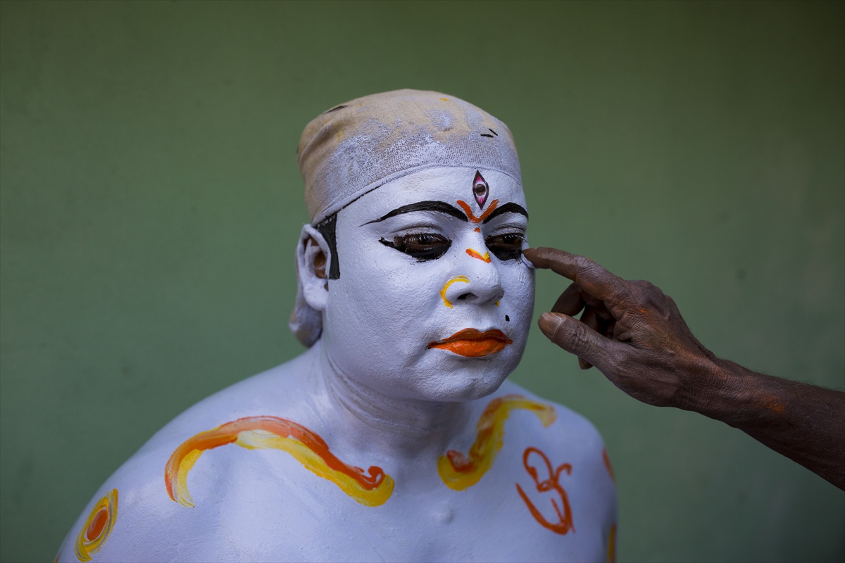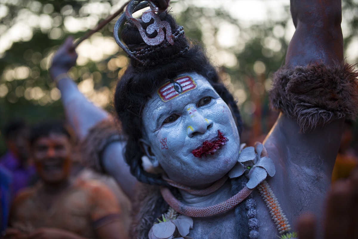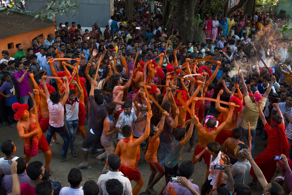 DHAKA, BANGLADESH – APRIL 13 : Hindu devotees prepare for a dance as they take part in a festival called Lal Kach (Red Glass) during the last day of the Bangla month in Munshigonj, Dhaka, Bangladesh on April 13, 2018. The festival is well known for the local community for more than hundred years. The Hindu youth and men paint themselves with red color and attend a procession holding swords as they show power against evil and welcome the Bengali New Year 1425.