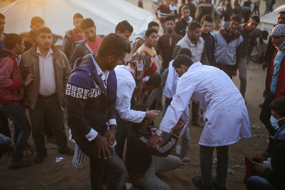 KHAN YUNIS, GAZA: Palestinians cover their face to protect themselves from tear gas as they stage a demonstration demanding the right of return and removal of the blockade following the “Great March of Return” in Khan Yunis, Gaza on April 01, 2018.