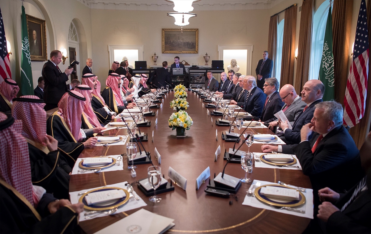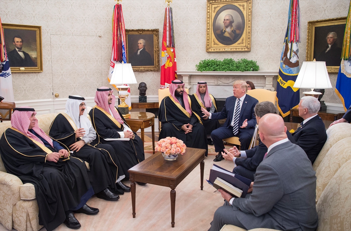 Trump, Saud Al Saud meeting March 21, 2018 WASHINGTON, USA: U.S. President Donald Trump (R) poses for a photo with Crown Prince Mohammed bin Salman Al Saud (L) of Saudi Arabia in the Oval Office at the White House.