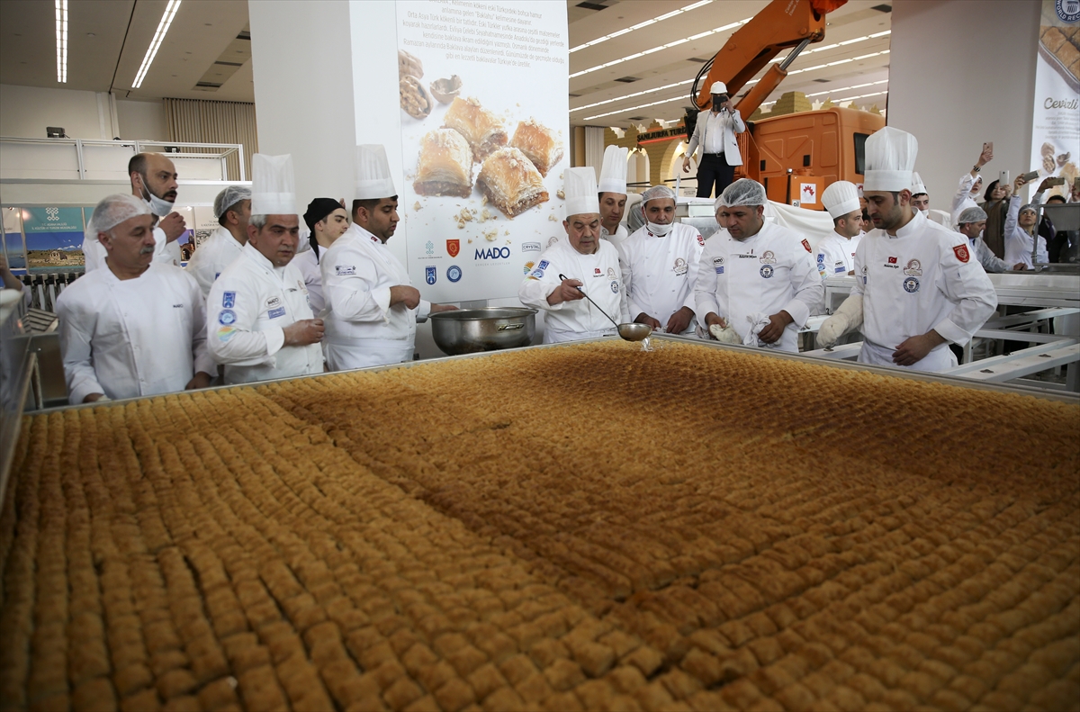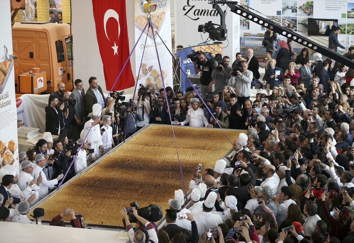 ANKARA, TURKEY: Turkish chefs break the Guinness record of “The Biggest Baklawa of the World” on Travelexpo 3rd International Tourism Fair and Gastronomy Summit at ATO Congresium in Ankara, Turkey on March 22, 2018. The baklawa, weighted at 515 kgs, 2,5 meter width and 7,5 meter-long, consists of 11 thousand 800 slices.