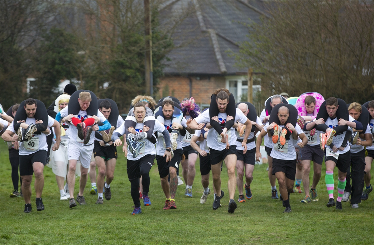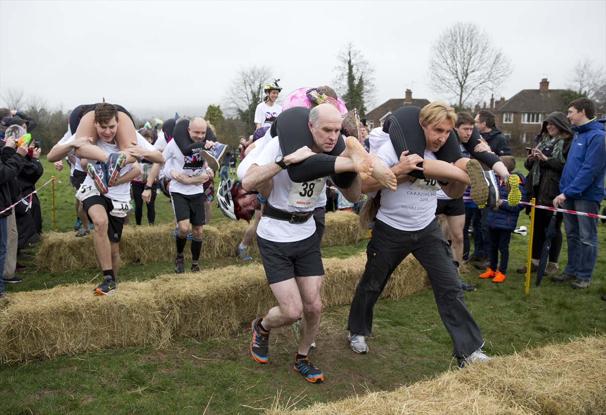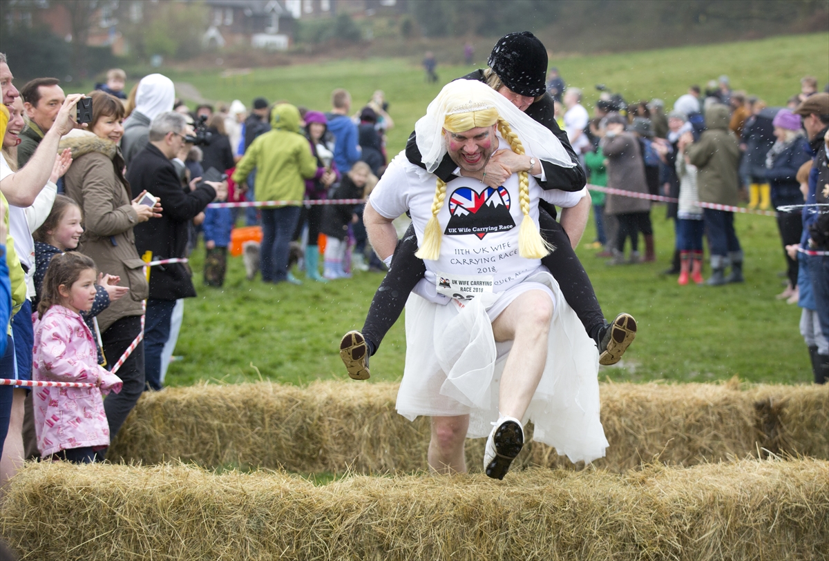 DORKING, UNITED KINGDOM – APRIL 8: Competitors take part in the 2018 Wife Carrying Race in Dorking, Surrey.