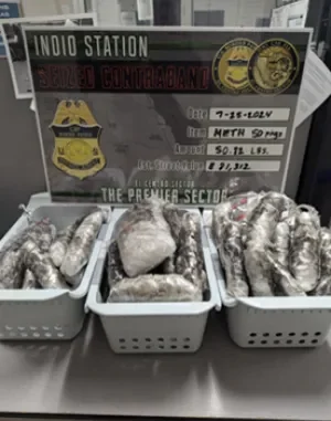 A Border Patrol K-9 team, trained to detect concealed people and illegal drugs, alerted agents to the vehicle. A search revealed 50 wrapped bundles of methamphetamine hidden in multiple quarter panels of the SUV. The driver, child, vehicle, and suspected drugs were transported to the Indio Border Patrol Station for further processing, where the drugs were confirmed to weigh 50.82 pounds.